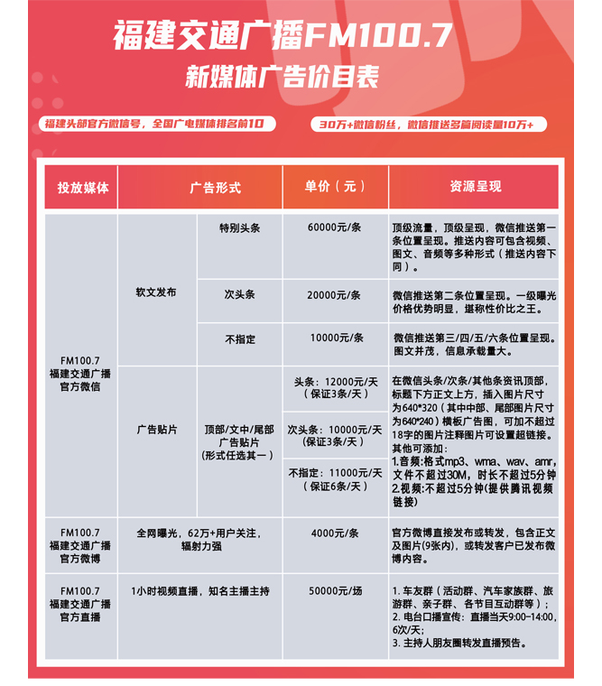 福建交通廣播FM100.7微信公眾號(hào)廣告刊例價(jià)