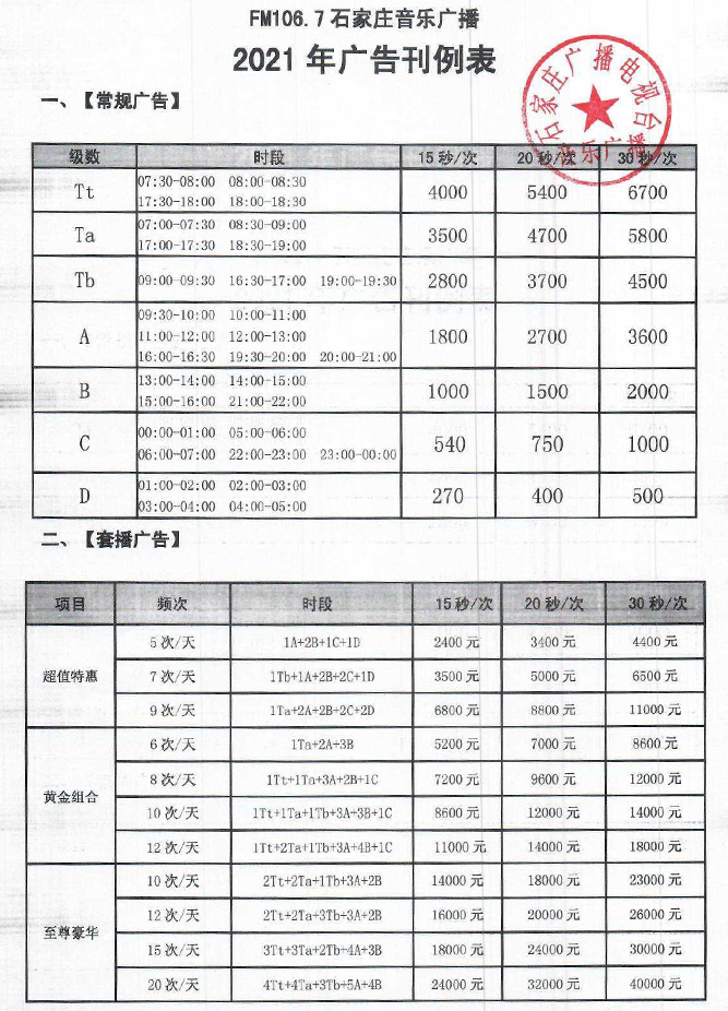 石家莊音樂廣播,調(diào)頻106.7兆赫,隸屬于石家莊廣播電視臺,成立于1994年9月23日,其前身是石家莊文藝廣播。2006年,石家莊音樂廣播進行大膽改革,成為河北省第一家類型化音樂廣播,倡導“創(chuàng)新、時尚、活力、陽光”,受眾定位是18歲到45歲、具有絕對消費能力的社會中堅力量、城市白領(lǐng)、私家車主,節(jié)目構(gòu)成是潮流音樂+資訊,24小時精彩不間斷。