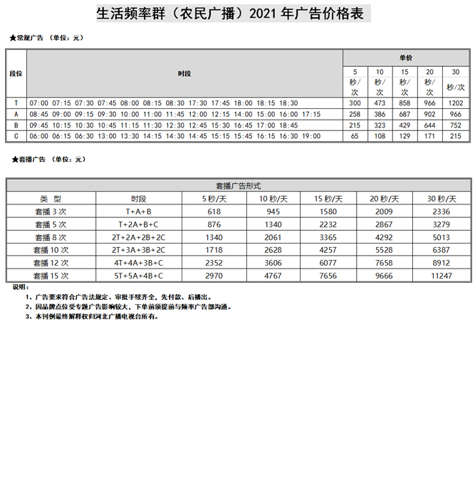 河北廣播電視臺農(nóng)民廣播開播于2006年8月28日,全天24小時播音。目前播出信號可有效覆蓋石家莊、保定、邢臺、邯鄲、承德、滄州、衡水、張家口、秦皇島,以及北京、天津部分地區(qū),覆蓋人口達(dá)8000多萬,是河北省內(nèi)最具專業(yè)性、權(quán)威性、實(shí)用性和影響力的對農(nóng)廣播頻道。