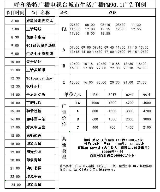 城市生活廣播以“走出直播間,開門辦廣播”為宗旨,以服務(wù)首府百姓為重點(diǎn),以民生關(guān)注為核心,形成了一批如《咖啡百味茶》《大學(xué)時(shí)光》《和諧社區(qū)》《印象青城》《玫瑰午夜》等有影響力的欄目,也是首府地區(qū)首家24小時(shí)播出、最具創(chuàng)新意識(shí)和發(fā)展?jié)摿Φ拿裆l率。
