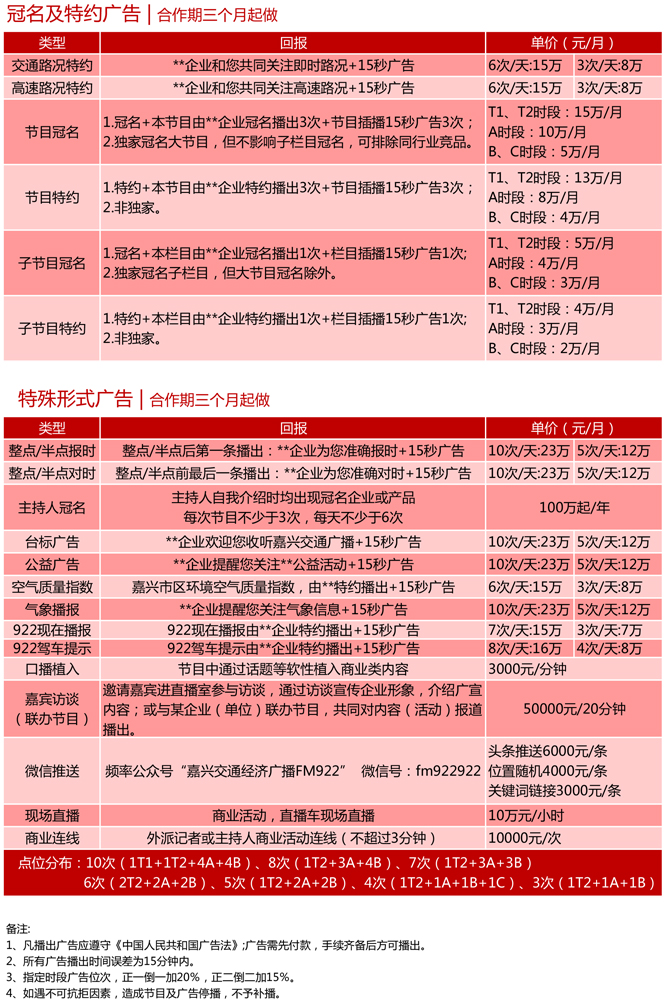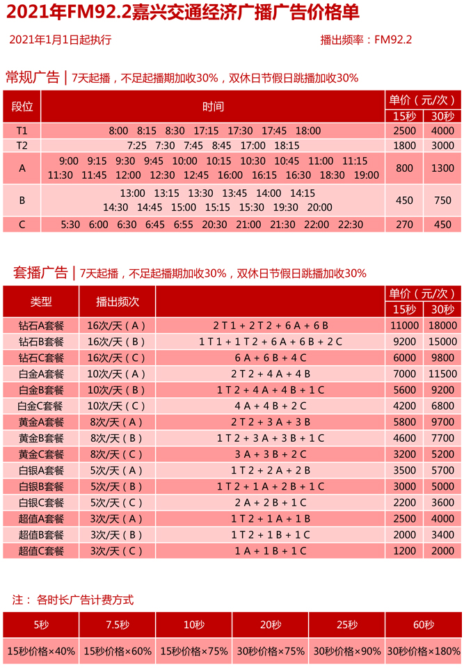 嘉興交通經(jīng)濟(jì)廣播FM92.2 2021年廣告刊例價(jià)格