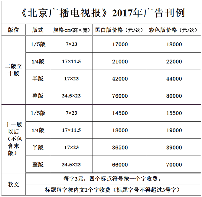 北京廣播電視報(bào)2017年廣告刊例價(jià)格