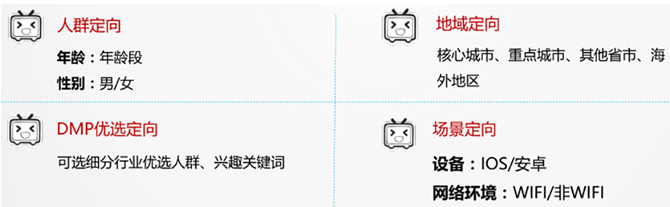 精準(zhǔn)定向是基于B站的人群畫(huà)像,來(lái)進(jìn)行對(duì)用戶精準(zhǔn)定向和只能投放的。精準(zhǔn)定向包括人群定向、地域定向、DMP優(yōu)選定向和場(chǎng)景定向。