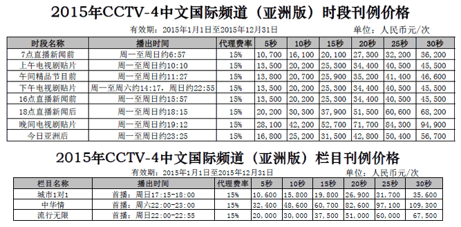 CCTV-4 中文國際(亞洲版)2015年廣告刊例價(jià)格