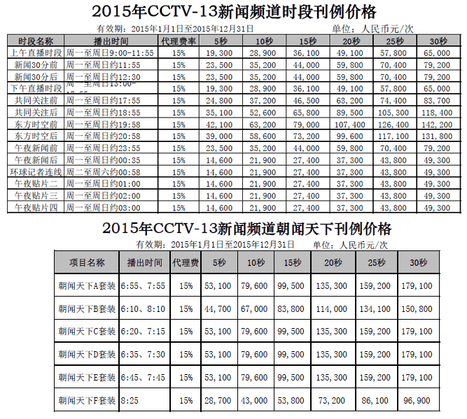 CCTV-13 新聞2015年廣告刊例價(jià)格
