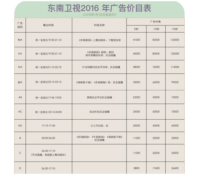 東南衛(wèi)視2016年廣告刊例價(jià)格