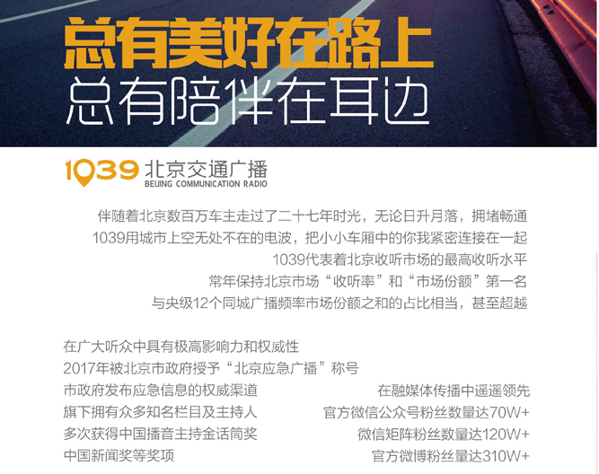 北京交通廣播又稱北京廣播電視臺(tái)交通頻率,于1993年12月18日正式開播,是北京廣播電視臺(tái)的廣播系列頻道之一,與北京市公安交通管理局合辦。使用頻率FM103. 9MHz(兆赫),有線調(diào)頻95.6兆赫,發(fā)射功率10千瓦。除周二的0:00-5:30機(jī)器檢修外,其余時(shí)間不間斷24小時(shí)播音。