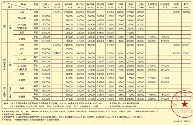 福州晚報2017年廣告刊例價格