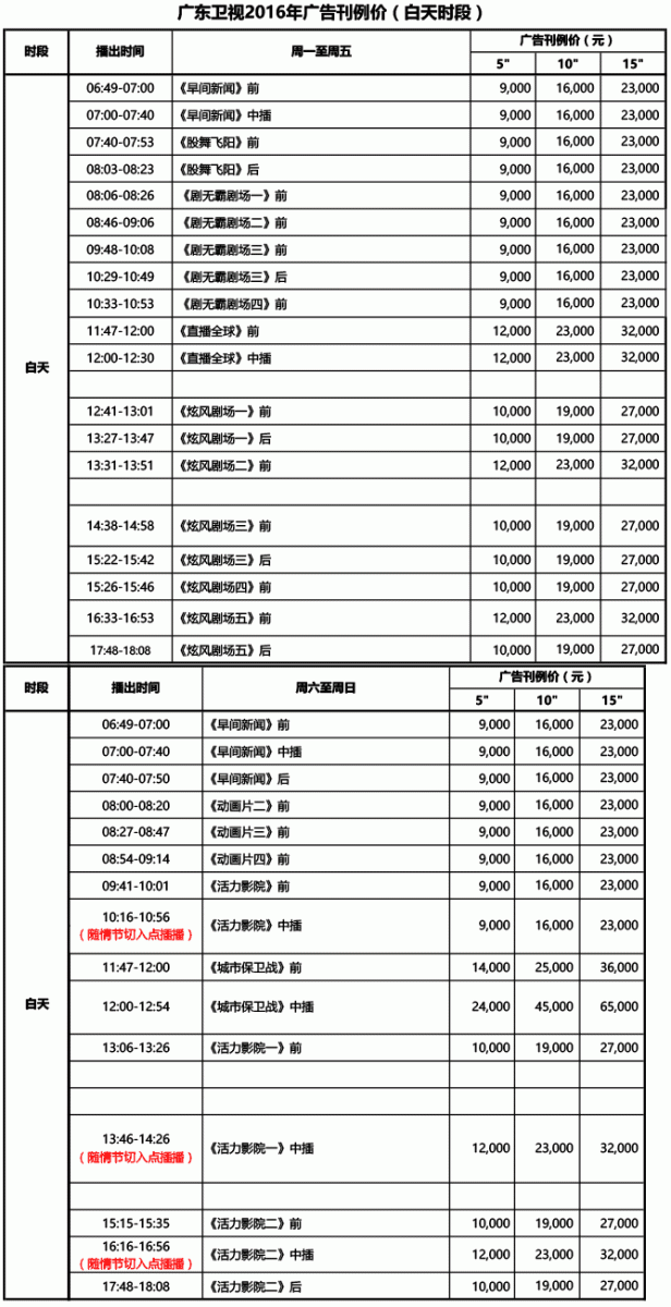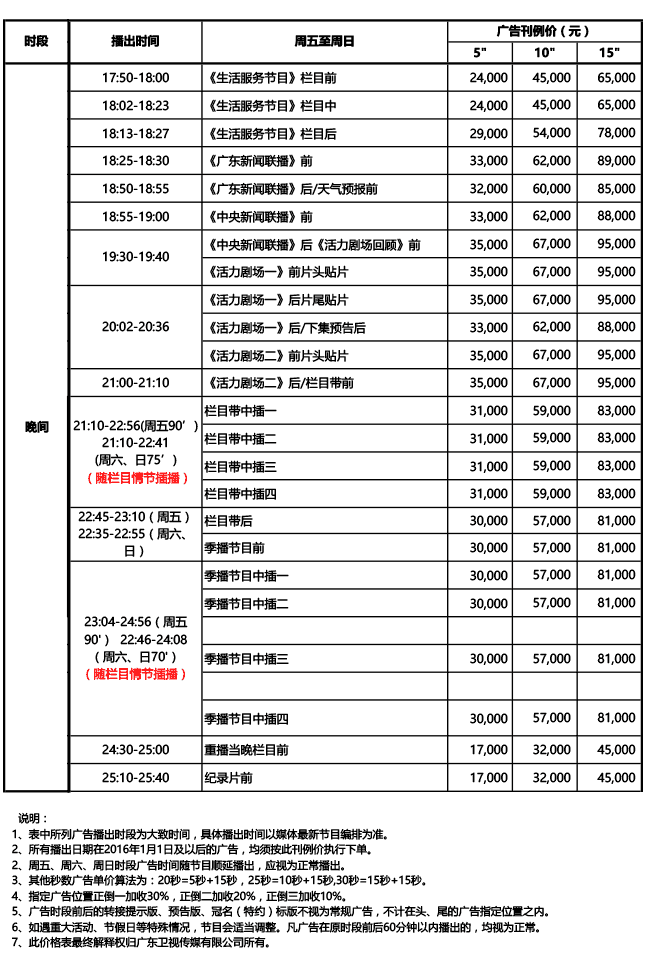 廣東衛(wèi)視2016年廣告刊例價(jià)格