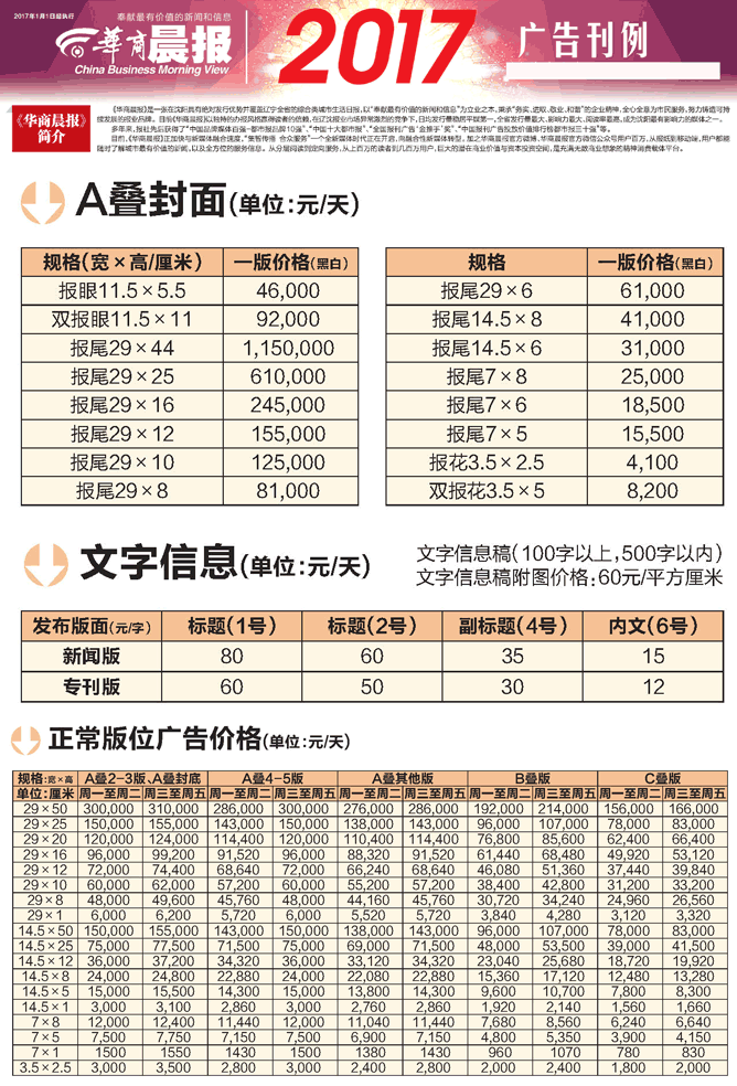 華商晨報2017年廣告刊例價格
