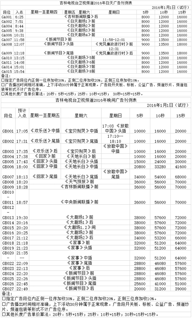 吉林衛(wèi)視2016年廣告刊例價(jià)格