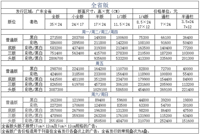 《南方都市報》版面廣告價格主要根據(jù)發(fā)行范圍差異定價,全省版、廣州版、深圳版以及佛/莞/惠、珠/中/江單一城市區(qū)域版價格為常規(guī)版面廣告價格;另有廣深《旅游時代》、《風(fēng)尚生活》、社區(qū)報以及分類廣告價格,為常規(guī)價格的補(bǔ)充。
