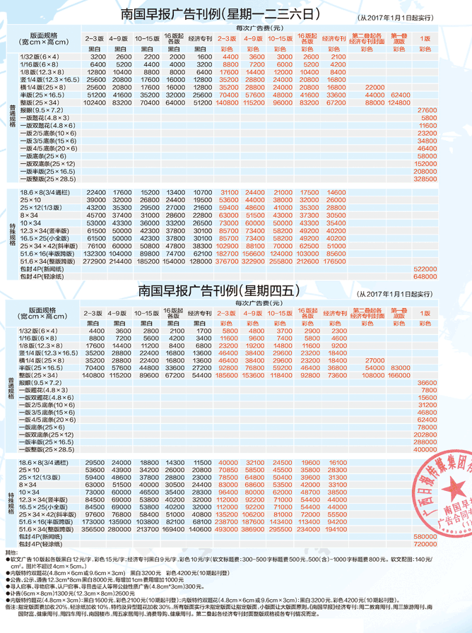 南國(guó)早報(bào)2017年廣告刊例價(jià)格