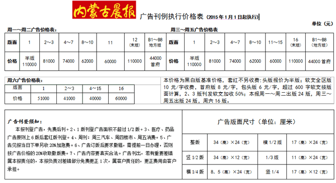 內(nèi)蒙古晨報廣告刊例價格