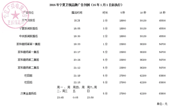 寧夏衛(wèi)視2016年廣告刊例價(jià)格