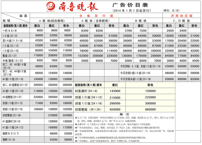 齊魯晚報(bào)2017年廣告刊例價(jià)格