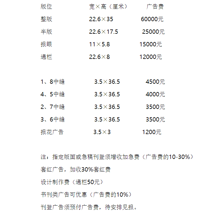 文摘報(bào)2017年廣告刊例價(jià)格