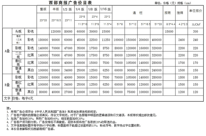西部商報(bào)2017年廣告刊例價(jià)格