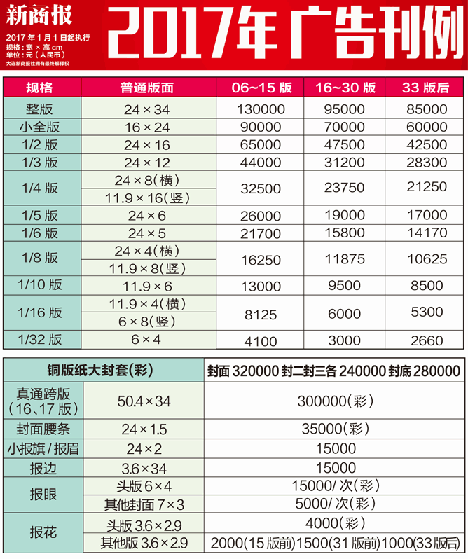 新商報(bào)2017年廣告刊例價(jià)格