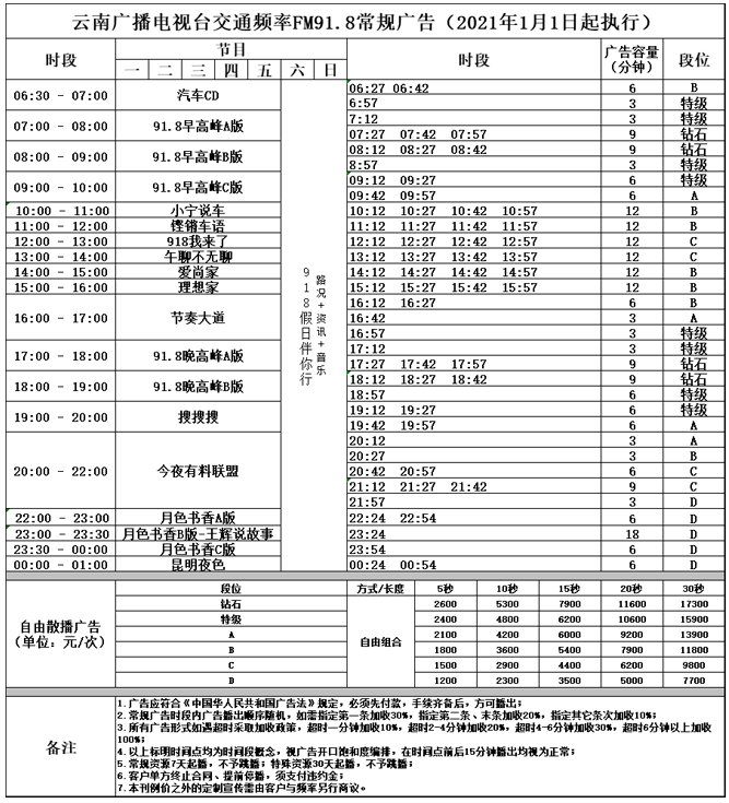 云南人民廣播電臺交通之聲在昆明及同頻覆蓋的大理、保山等地的頻點(diǎn)為FM91.8,于1999年4月1日開播,以省會昆明80萬輛機(jī)動車、200多萬輛非機(jī)動車以及省內(nèi)外大量進(jìn)入昆明的車輛駕乘人員、旅游觀光、工作流動人口為主要服務(wù)對象。
