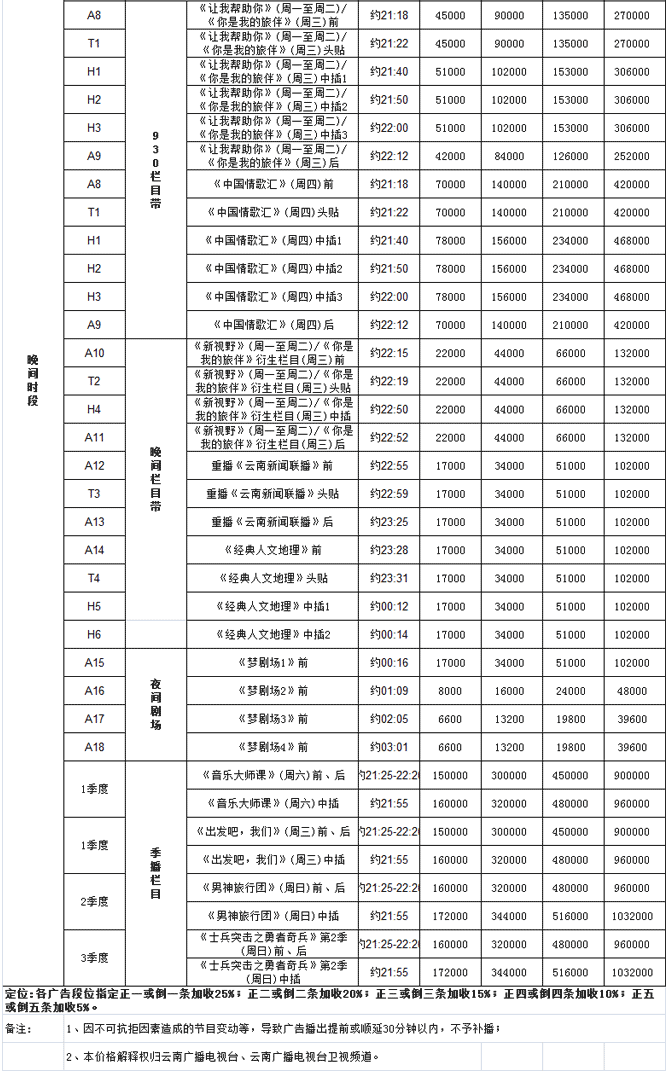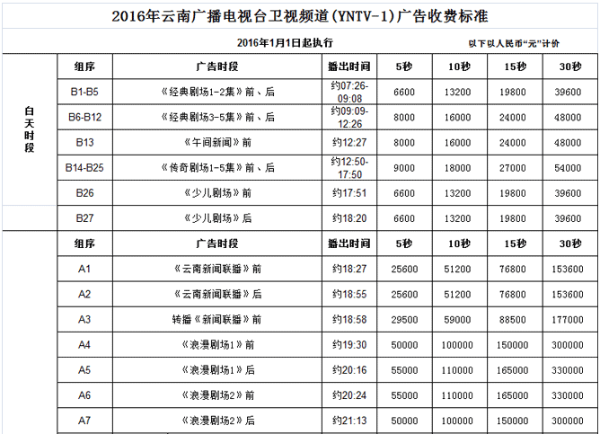 云南衛(wèi)視2016年廣告刊例價(jià)格