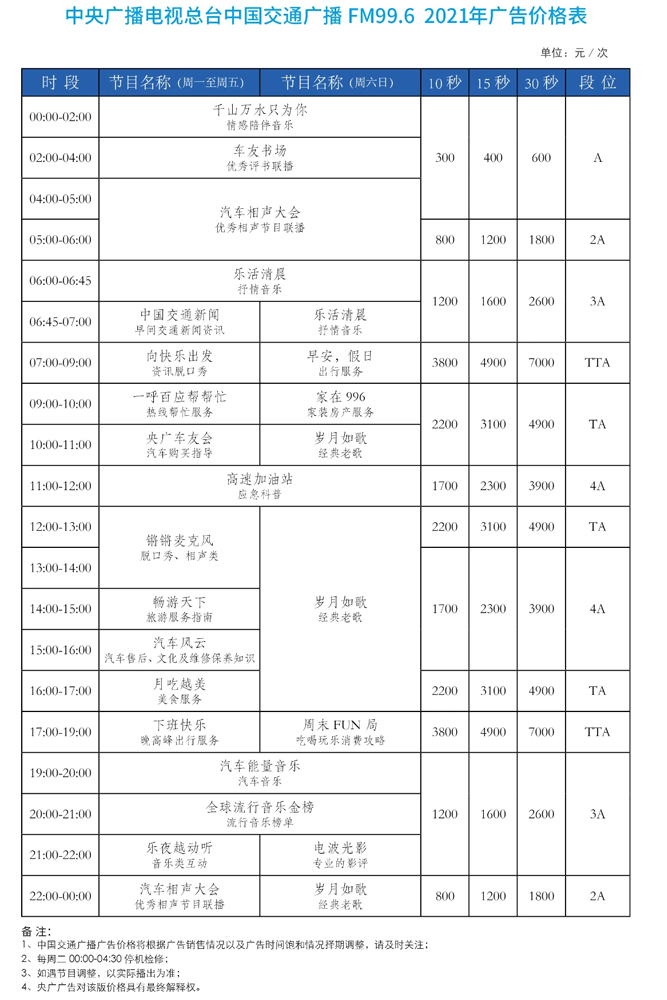 中央廣播電視總臺(tái)中國(guó)交通廣播是中央廣播電視總臺(tái)旗下全國(guó)覆蓋的廣播頻率,是第一家呼號(hào)是“中國(guó)”的交通廣播,是中國(guó)國(guó)家級(jí)交通廣播,也是國(guó)家應(yīng)急廣播體系的重要組成部分。中國(guó)交通廣播定位為“大交通”信息服務(wù),為中國(guó)全國(guó)參與公路、鐵路、水路、民航出行人群提供路況、新聞、氣象等專(zhuān)題資訊,在發(fā)生重大突發(fā)事件時(shí),根據(jù)應(yīng)急需要及時(shí)播發(fā)重要路況信息,部署應(yīng)急措施,起到預(yù)警疏導(dǎo)、聯(lián)絡(luò)溝通和信息通報(bào)作用。